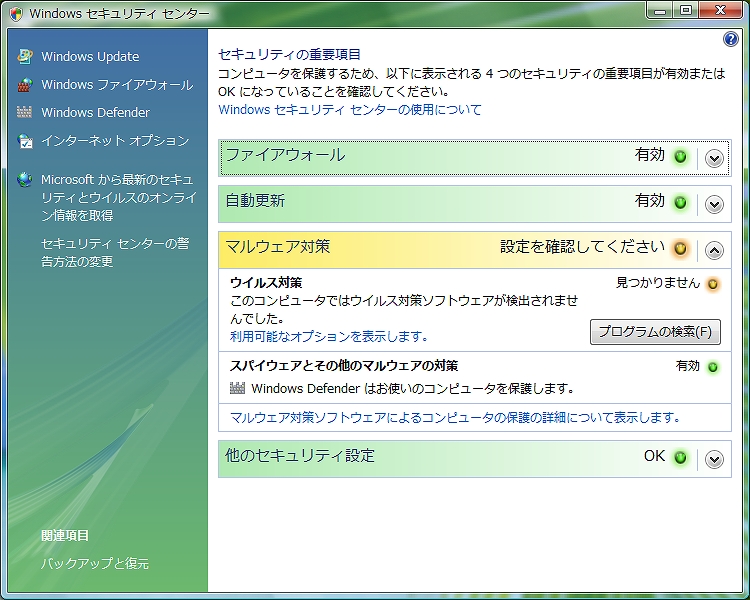 Windows Vistaには、Windows XP Service Pack 2と同様、Windowsのセキュリティ状態を統合的に監視するWindowsセキュリティセンターが搭載されている。