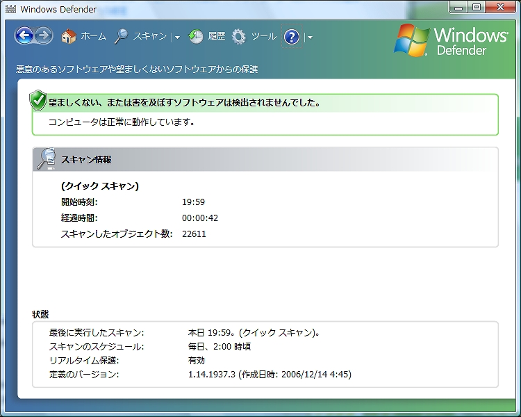 Windows Defenderには大きくわけて三つの機能がある。ひとつがスパイウェアを検索・除去もしくは隔離する機能。二つめは、スパイウェアが動作してパソコンの情報を盗み出すなどの破壊的行為を行おうとした際にこれを検出し、動作を防止する「リアルタイムスキャン」機能。そして三つめの機能が、スパイウェアの検出を行うためのパターンファイルの定期更新機能だ。マイクロソフトのサーバで公開されるパターンは定期的にアップデートされており、常に最新のスパイウェアに対応する。