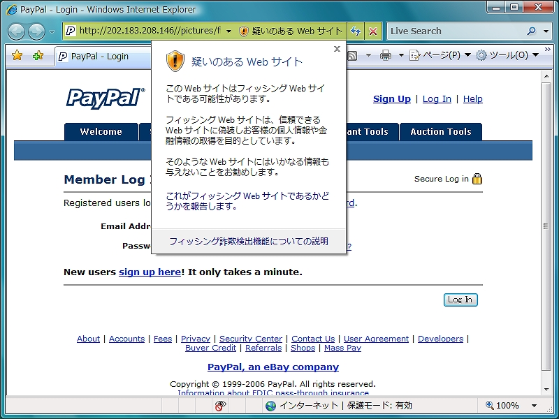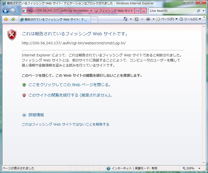 もうひとつは、表示しようとしたページの内容を判定し、フィッシングサイトであることが疑わしい場合にはこれを通知する機能で、フィッシングサイトであることがいまだ報告されていない新しいサイトであっても、詐欺行為を防止することができる。