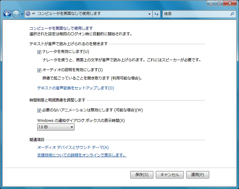 聴覚障害者サポート機能では、音による通知を画面表示で示すビジブルベル機能が強化され、通知方法がよりこまかく選択できるようになった。また視覚障害者向けとして、画面表示が見えない状態でもWindows操作を可能とするための「コンピュータを画面なしで使用」する機能が搭載されている。
