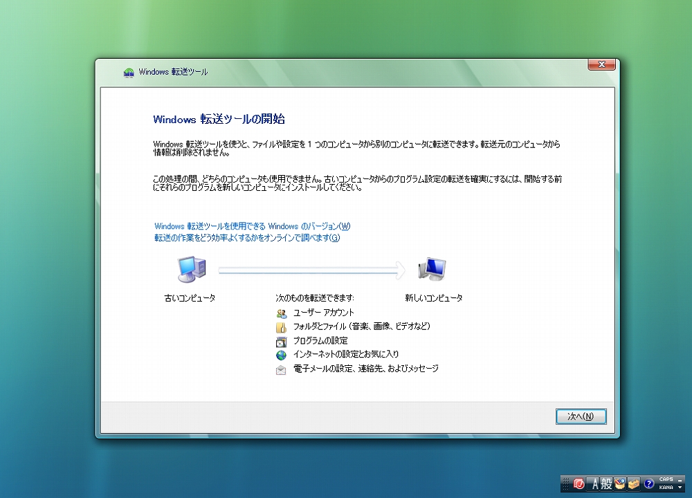 こんな時役にたつのが、従来の設定を新しい環境、すなわちWindows XPの環境をWindows Vistaへと引き継ぐことができる「Windows転送ツール」(図18)だ。「Windows転送ツール」では、移行前のOS上と移行後のOS上でツールを起動することで、移行前OSで設定されたOS設定内容やアプリケーションの設定内容、ユーザファイルなどを新たなOSへと自動的に移行できる。