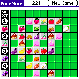 「NiceNine」は画面上のコマをすべて消去するとクリアとなる1人用のパズルゲーム。「New Game」からゲームを開始すると、9×9のフィールドへ野菜や果物のコマが格子状に配置された画面が表示される。プレイヤーはスタイラスで空いている地点にコマを置いていくが、このとき、