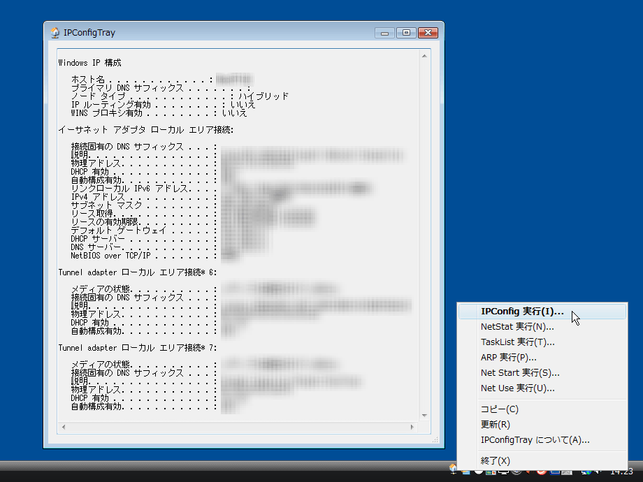 タスクトレイメニューからコマンドを実行できる。画面左側はIPConfigの実行結果