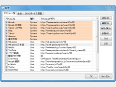登録済みアクションのうち、Google、Google 日本語、Yahoo! JAPAN、Bing、Amazon、楽天市場は、特に「システムアクション」と呼ばれ、ユーザが編集したり、削除したりすることはできない(有効/無効の選択は可能)。残りは「ユーザアクション」で、編集・削除することが可能。ユーザが新たな「ユーザアクション」を追加することもできる。アクションを編集する場合は、名称と対象サイトのアドレスを指定する。場合によっては引数を指定することも可能だ。