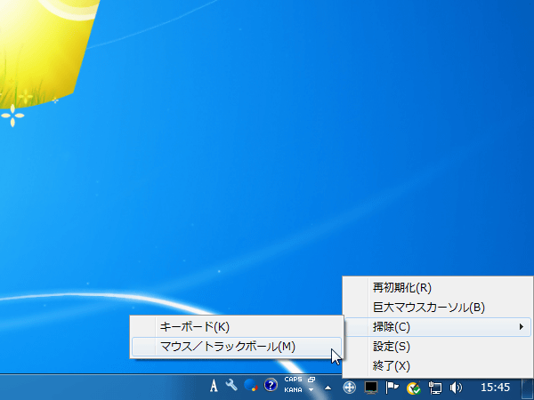 タスクトレイメニュー。キーボードやマウス/トラックボールからの入力を破棄する「掃除」支援機能もある