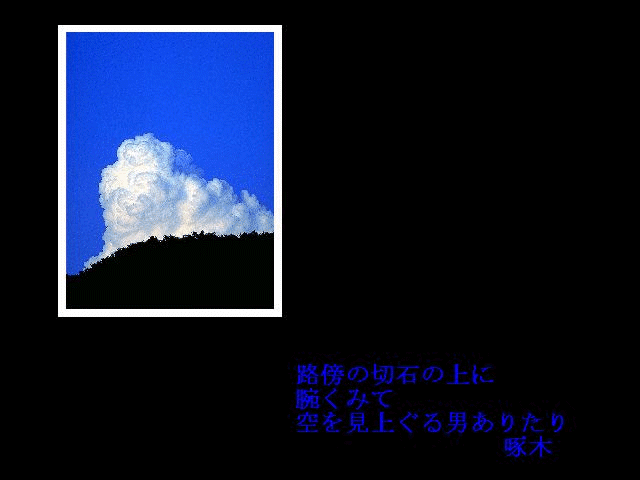 黒い画面の中に蛍が光りながら飛び回るという、いかにも夏の夜向きなスクリーンセーバー。シンプルだが、同梱の虫の声サウンドファイルが雰囲気を盛り上げる。 蛍だけでなく、設定で「火の玉、黄砂、こおり、水玉、さくら、ゆき」などにも切り替えることが可能。とはいっても、色が変わるだけで動きは同じだが。フリーソフトらしいシンプルさがGOOD。 石川啄木の短歌集「一握の砂」の中から夏向きの五歌を選び、夏の写真と組み合わせることで、独特の雰囲気を出すことに成功したスクリーンセーバー。ときおり流れるセミの声が実にしみじみとしていて、いい。 設定はパスワードと、サウンドの有無だけだが、昔なつかしいアルバムを覗くようで、お勧めの1本。 |