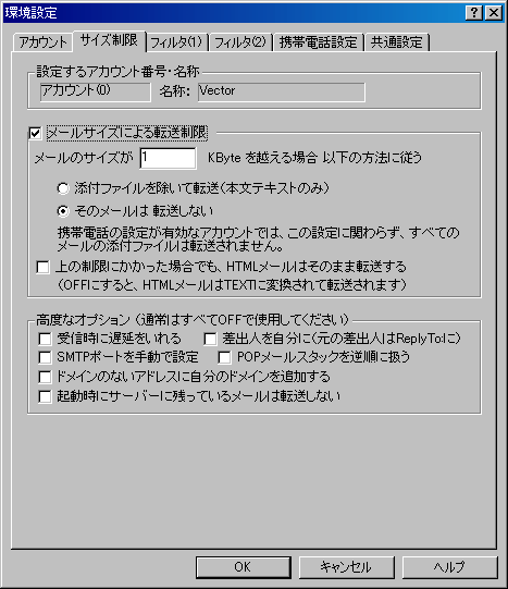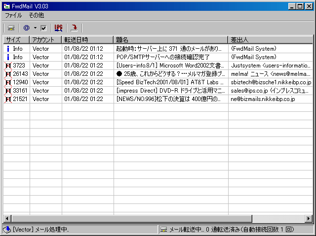 「Forward Mail」というソフト名が示すように、届いたメールを別のメールアドレスに転送する機能を持つメール転送ソフト。こういう点では上に述べた「simalis」と同じなのだが、「Forward Mail」の場合、モバイルPCや携帯電話などのモバイル環境向きの機能が数多く装備されているのが特徴だ。 モバイル環境の場合、携帯電話やPHSなど通信速度が遅く、かつ従量制料金で接続されることが多いという特性を持っている。また、OSが必ずしもWindowsであるとは限らず、メールを読む際の画面サイズも小さいことが多い。そのため、添付ファイル付きのメールや長文のメールなどは仮に届いたとしても、実際には満足に読まれなかったり、利用されないことが多いものだ。 「Forward Mail」はこのようなモバイル環境の特性を考慮し、メールサイズによって転送する/しないを決めたり、添付ファイルだけを削除して転送したり、指定されたアドレスから(あるいは指定したアドレスへ)のメールのみを転送したり、SPAMメールは転送しないようにといった、フィルタリング機能が非常に充実している。