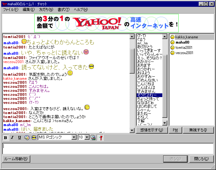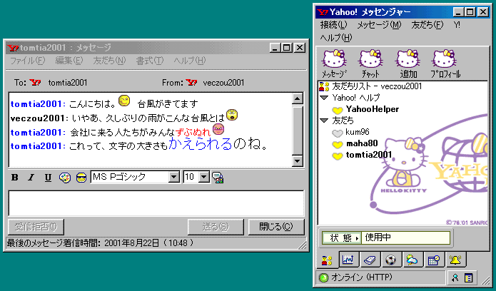 電子メールではなく、サーバを経由したリアルタイムにメッセージ交換を行うことができるインスタントメッセンジャーソフト。1対1でメッセージを交換して会話するのはもちろんのこと、複数のメンバーが同時に参加した状態での会話も行える。仲間内での会話や複数メンバーによる遠隔会議などに利用することもできる。 Windows版のほか、Macintosh版やJava版、Windows CE版などが用意されており、複数プラットフォーム間でメッセージを交換することも可能。Windows版ではリアルタイムチャットを行うこともできる。 基本的にはテキストのみの交換となるが、太字や斜体、アンダーライン、文字色の変更など簡単な文字装飾なども利用することができる。またメッセージの送信時に、あらかじめ用意された顔文字アイコンを付けて送信することも可能だ。