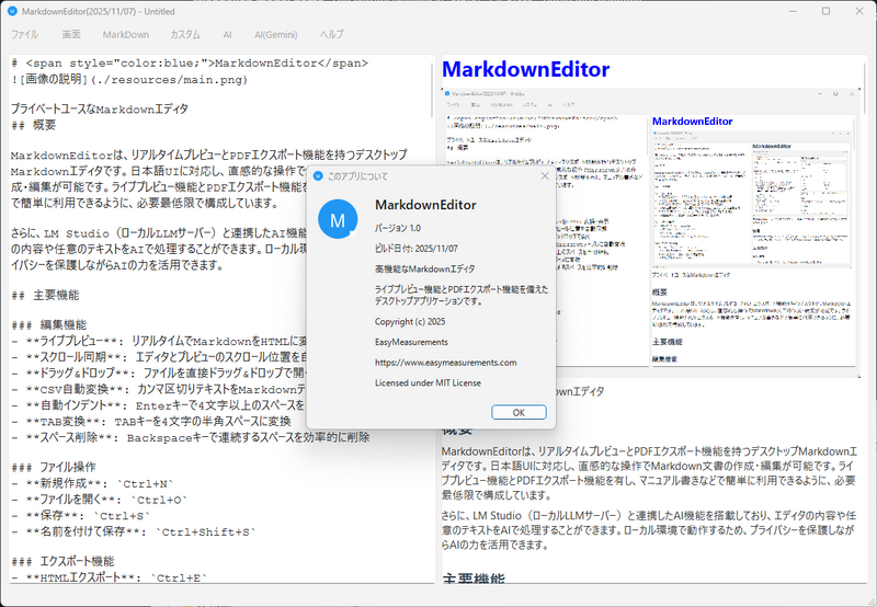 Markdown 形式の文書を作成するソフト ライブプレビュー、拡大縮小、PDF/HTMLエキスポートに対応