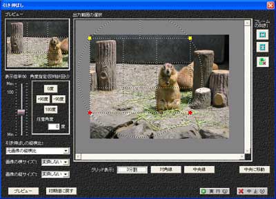 現像室で引き伸ばし機を操作するように、写真の拡大/縮小・回転ができます。さらに、今回のバージョンでは、引き伸ばしたときの構図を取りやすくするために3分割線や対角線といったグリッド表示ができるようになりました。
