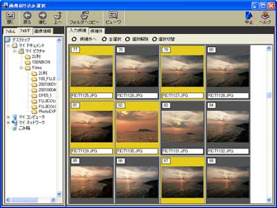 ただ単純に写真を読み込むだけでなく、"作品にするべき"写真を適切に選別するために「絞り込み入力」機能を追加しました。Windowsのフォルダや『デジカメde!!同時プリント』で管理している「フィルム」の中にあるデジタル画像データをサムネイル一覧表示させるだけでなく、その中から不必要な写真を「候補外」へ選別することで、必要な写真を最小限に絞り込むことができます。さらに、似たような構図の写真を並べて拡大して見比べることができる専用画像ビューワを呼び出し、大きな画像でピントの甘さや色調などを納得のいくまで見比べて、取捨選択できます。
