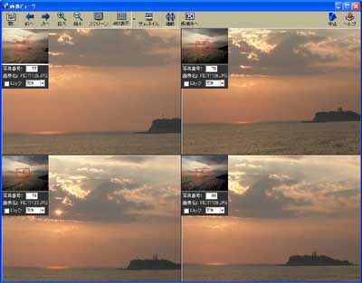 専用画像ビューワは、2枚〜4枚の写真データを並列して見比べられるほか、表示した写真を連動して拡大/縮小したり、表示部分を移動したりできます。実際にポジフィルムをライトテーブル上に置いてルーペでのぞきながら写真を選択する以上の便宜性を、モニタ上で実現します。