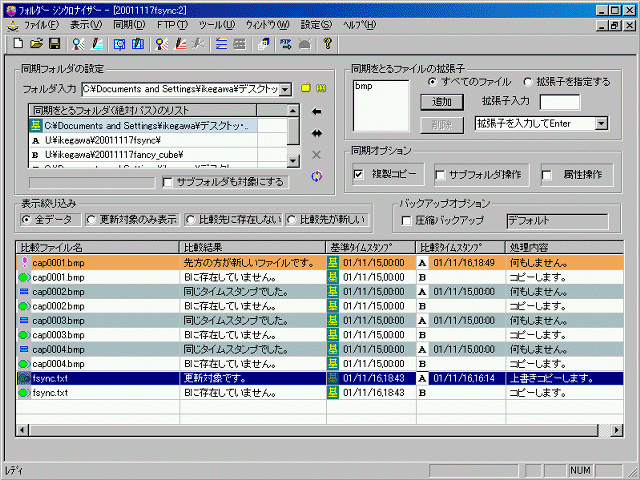 基本フォルダと複数の同期先フォルダを指定すると、色分けされたリストビューを表示。処理が終了すると色も変化する