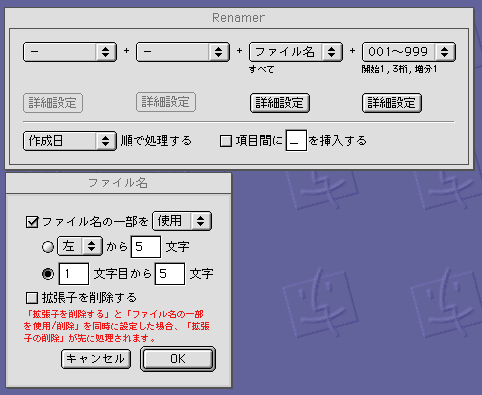 ファイル名には「日付」「フォルダ名」「ファイル名」「テキスト」「aa〜zz(までのアルファベット)」「001〜999(までの数字)」を、四つまで自由に組み合わせて指定できるほか、拡張子を追加することも可能。それぞれの項目では、さらに細かな指定が可能で、例えば、変換前のファイル名の一部を変換後の名前として使いたい場合には、その文字列の左・右から数えて何文字目の文字列を、何文字使うかといった指定を行える。任意の文字列のみ削除するといったことも可能。