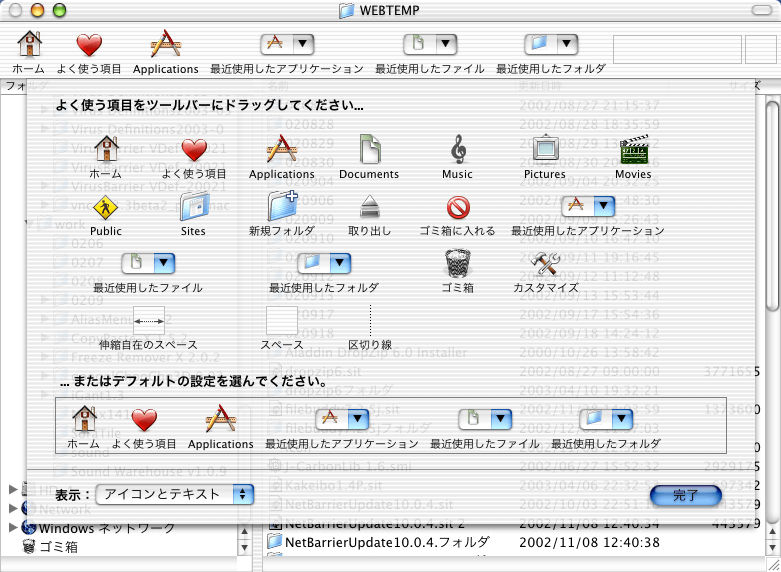 ツールバーのカスタマイズ。Finderの項目と若干異なる