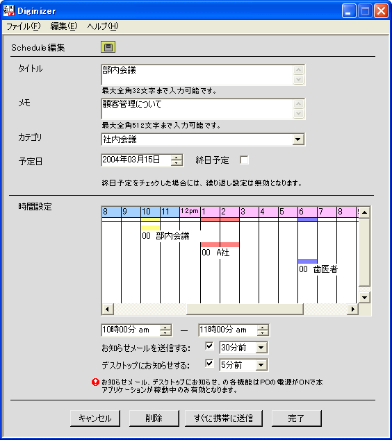 スケジュール編集画面。アラームやお知らせメールなどを設定することも可能