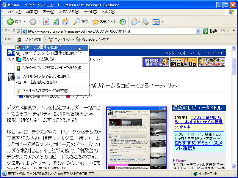 IEのツールバーからページ中の画像/動画をまとめてダウンロード