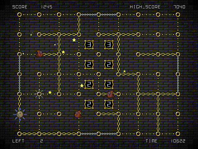 敵に注意しながら、数字パネルを鎖で囲んで消滅させる。敵をやっつけると、ボーナスの星などのアイテムが出現する
