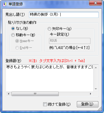 「単語登録」画面。登録する文字列を「登録語」エリアに入力し、「見出し語」を指定する