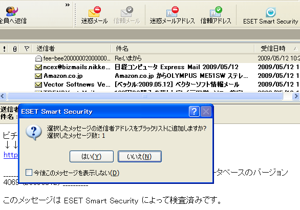 迷惑メール対策機能。メールソフトに組み込まれるツールボタンから、迷惑メールの登録などを行える
