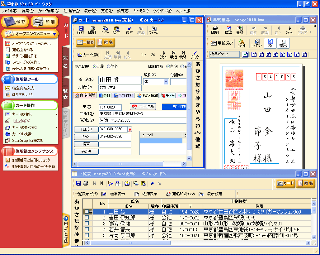 住所録画面。宛名面のイメージを確認しながら登録できる。一覧表示で住所などを確認することも可能