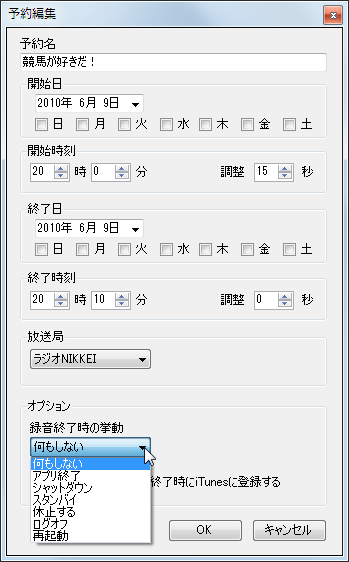予約編集画面。開始/終了日時や録音終了後の動作を設定できる