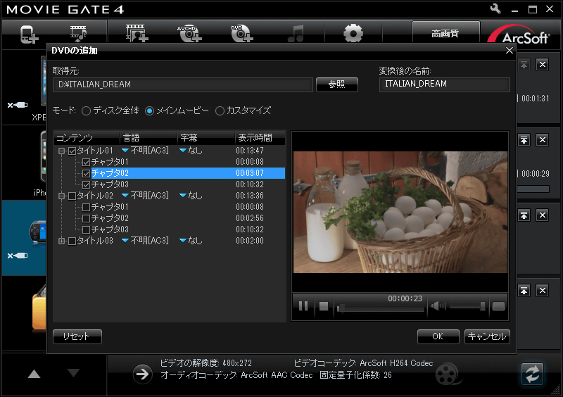 DVDやAVCHDディスクからは、チャプター指定による部分変換も行える