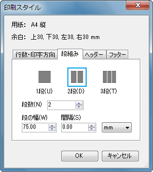 印刷スタイル設定画面。多段組み印刷も可能。段の幅や間隔も指定できる