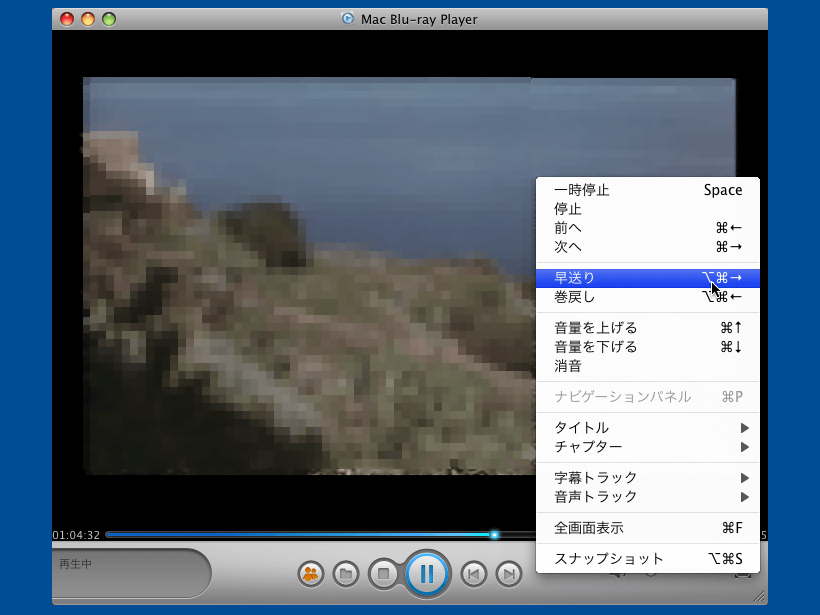 動作中の画面。再生位置の移動や音量の変更などの操作は、コンテキストメニューからも行える