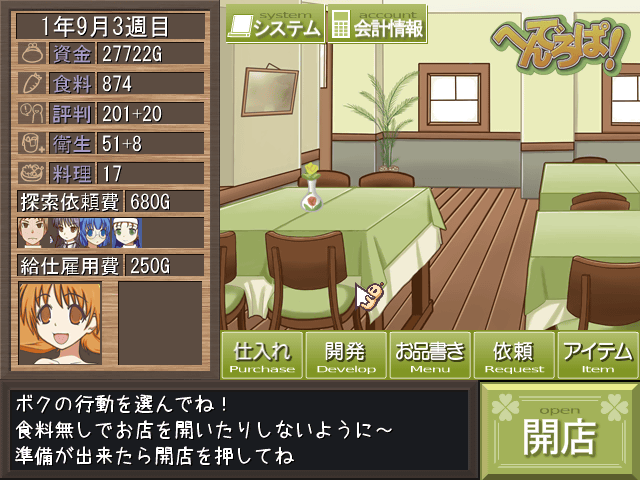 料理の開発や販売に特化したシミュレーションパート。食材の仕入れなどの面倒な過程が省かれ、煩わしさを感じさせない