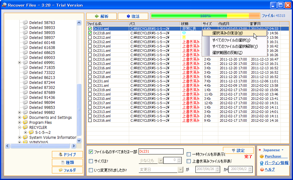 対象をファイルの種類で分類してくれる、簡単操作のファイル復元ソフト
