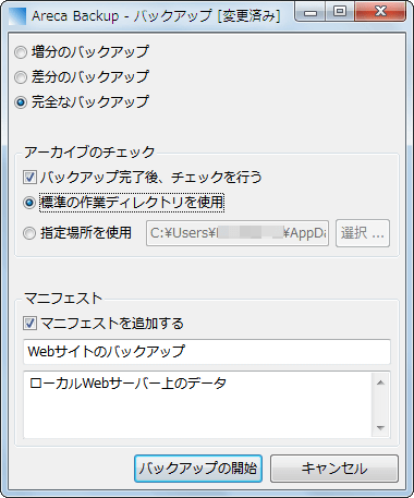 実行時に「完全」「差分」「増分」のいずれかを選択できる