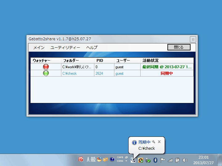 動作中の画面(中央がWindowsフォーム)。ローカルマシンのフォルダとサーバとの間でファイルを自動同期してくれる