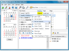 数多くのタスクも、日付ごとの一覧リストで効率よく管理できるソフト。タスクにファイル/フォルダなどを添付することも可能。「Daily To-Do List」は、シンプルなデザインで見やすい、一覧リスト形式のToDo管理ソフト。各タスクには優先度やタイプを設定でき、設定したプロパティでタスクを並べ替えたり、色分けしたりすることが可能。わかりやすく管理できる。タスクにはファイル/フォルダなどを添付できるほか、覚え書きなどを記したメモを登録することも可能。タスクリストの印刷やHTMLへの書き出しにも対応する。リマインド機能もある。