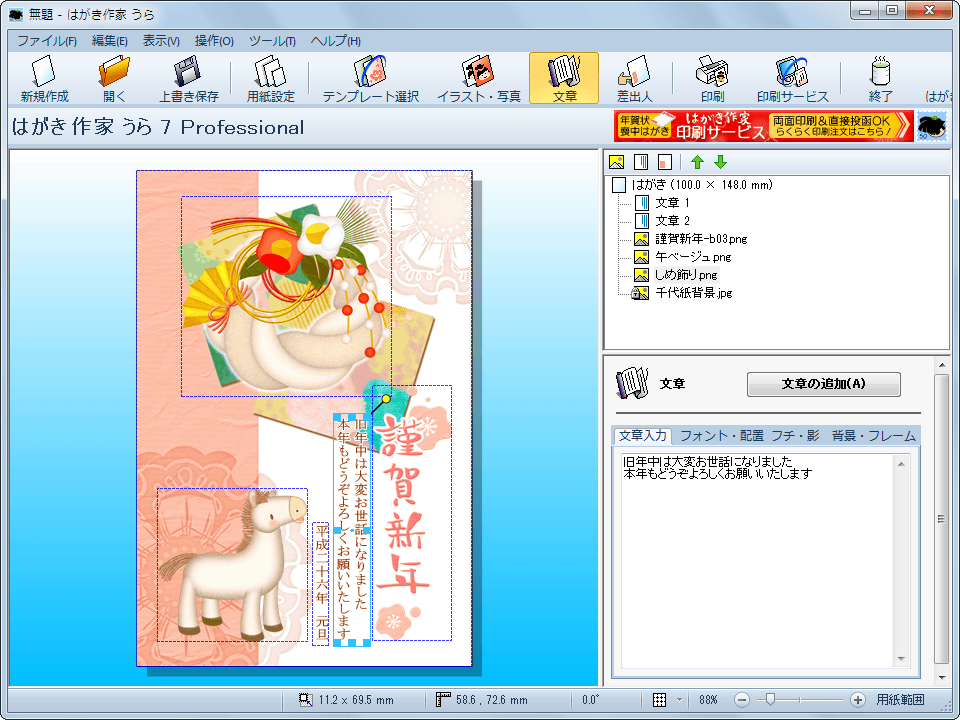 「はがき作家 うら」画面。文章やイラストを配置して、文面をレイアウトする
