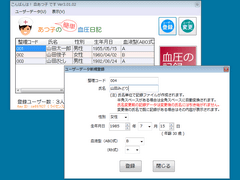 簡単な操作で使うことができ、無理なく続けられる血圧・脈拍の記録ソフト。複数ユーザを登録することでき、家族や部署内などの健康データをまとめて管理できる。「あつ子の簡単血圧日記」は、毎日、継続して記録した血圧と脈拍の測定結果を、標準値や過去のデータと比較したり、ランキング表示で確認したりすることにより、現在の状態をチェックできる“健康管理支援”ソフト。「氏名」「性別」「生年月日」「血液型(ABO式/Rh式)」といったユーザデータを登録して、利用を開始する。記録された血圧や脈拍を折れ線グラフにし、日々の変化を確認することも可能。健康の状況が天気予報風に表示される「元気予報」機能も搭載する。