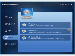 メイン画面は、起動時に表示される「ホーム」のほか、「バックアップ」「復元」「クローン」「ユーティリティ」の各画面で構成され、画面左側のボタンで切り替える。シンプルなデザインで、はじめてでも直感的に操作できる。