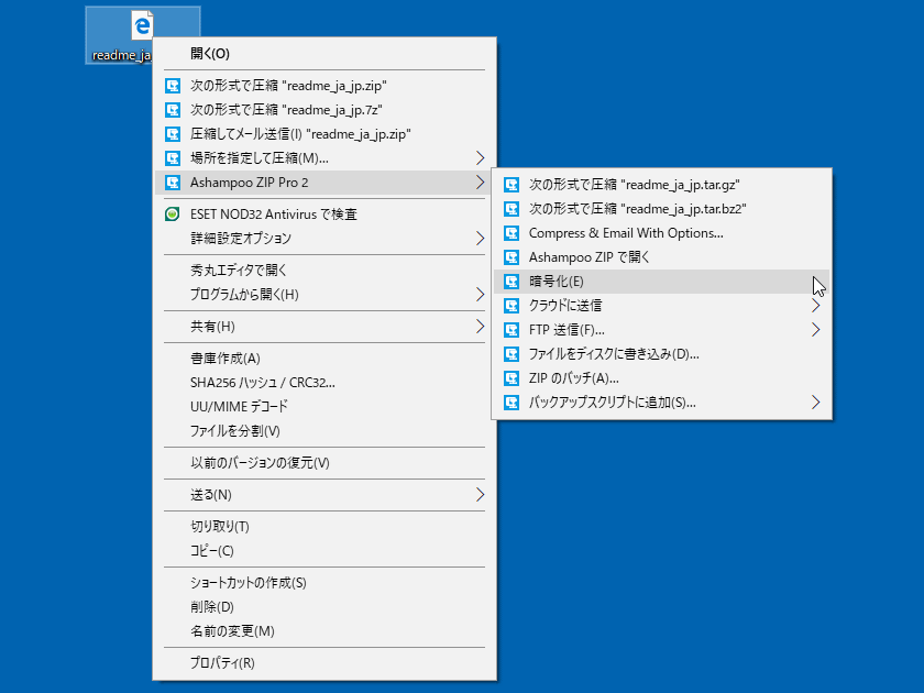 アーカイブではないファイルのコンテキストメニュー。暗号化やクラウドへの送信といった機能も利用できる