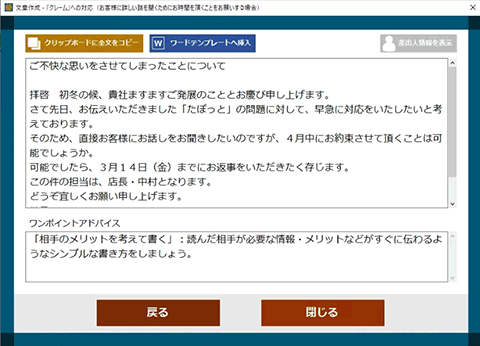 画面上部の「差出人情報を表示」ボタンは、クリックすると「差出人の設定」でセットした情報を署名として文末に挿入できるので、メール署名の情報をセットしておけば、そのままメールソフトにコピー&ペーストできて便利だ。また、「クリップボードに全文をコピー」や「ワードテンプレートに挿入」ボタンをクリックする事で、完成した文章をメモ帳やWord等、別のソフトにコピーして利用する事もできる。