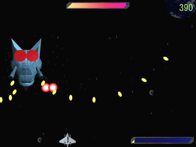 ![]() 上述した通り、ハイスコアを狙うには波動砲を多用することが鍵となる。しかし、そのためには一定時間攻撃を中断する必要がある。その間、敵の攻撃を避け続け、さらに波動砲を使うベストポイントに自機を位置させねばならない。これがなかなかシビアなのだ。シューティングが得意な人ならば、あるいは造作ないことなのかもしれないが、初級から中級レベルのプレイヤーでは、ハイスコアかステージクリア(イコール耐久力を多く残す)のどちらかを狙うのが精一杯ではないだろうか。 とはいえゲームそのものの完成度は高く、非常に楽しめるのも間違いないところ。操作性も動きも十分満足できるものに仕上がっているので、シューティング好きな人ははもちろん、そうでない人にもお勧めできるゲームだ。エネルギー増幅時の音がクセになりそうだ! (芹澤 亮)