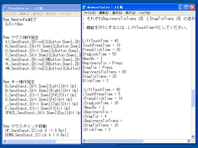 設定は、NewtonPad.iniとThumbKey.iniのファイルをテキストエディタなどで直接編集することで行える