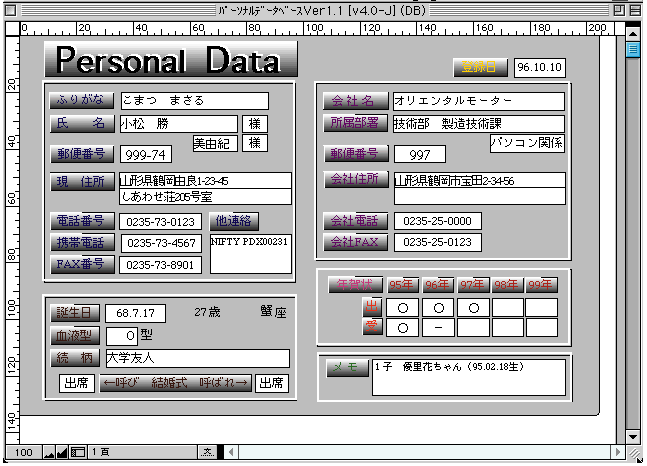 「パーソナルデータベース」は、「クラリスワークス」のデータベース機能用の住所録テンプレート。「ファイルメーカーPro」に比べると、「クラリスワークス」のデータベース機能自体に限界があるため、前の二つほど多機能とはいえない。とはいっても、個人が住所録の管理やはがき宛名印刷に利用するには十分な機能を備えており、入力画面のわかりやすさは抜群。気軽に使えるのがうれしい。