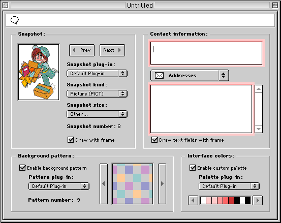 次は背景の設定をする。左下の[Background Pattern:]で、[Enable Background Pattern]のチェックボックスがチェックされていることを確認し、左右の矢印ボタンでパターンを選ぼう。次に右下の[Interface Colors:]も同様に[Enable Custom Palette]をチェックし、矢印ボタンで色を選ぶ。