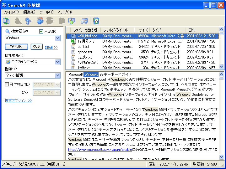 さまざまな条件を指定して検索でき、ファイルの内容を確認できる文書ファイルの検索を高速に行えるソフト。あらかじめハードディスク内のファイルからインデックスファイルを作成しておき、そこから検索を行うため、すばやくファイルを探せるのが特徴だ。