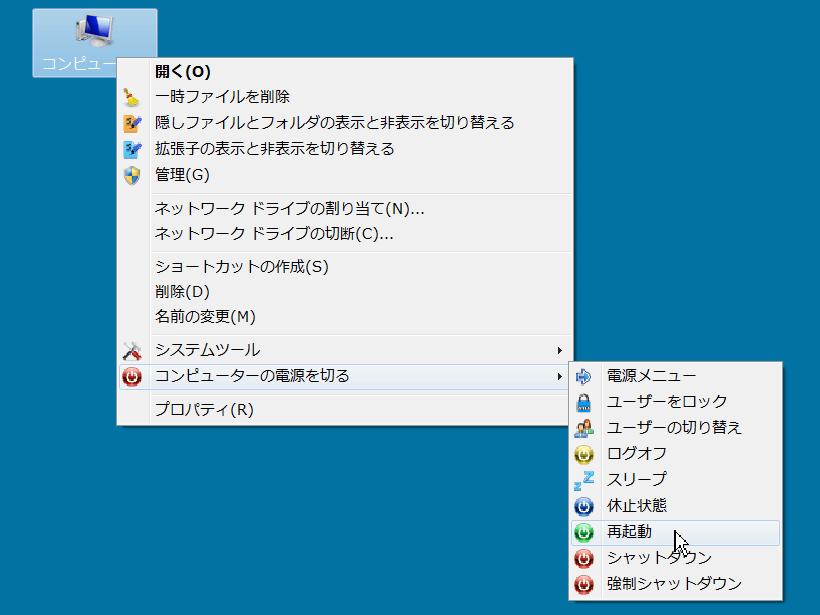 設定適用後のコンテキストメニュー。終了処理をサブメニューから選択して実行できるマイコンピュータなどのコンテキスト(右クリック)メニューに項目を追加し、便利な機能にすばやくアクセスできるようにしてくれるユーティリティ。
