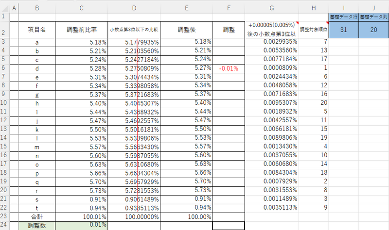Excelの表計算で、構成比率合計が100.00%にならない時、これを自動で調整する