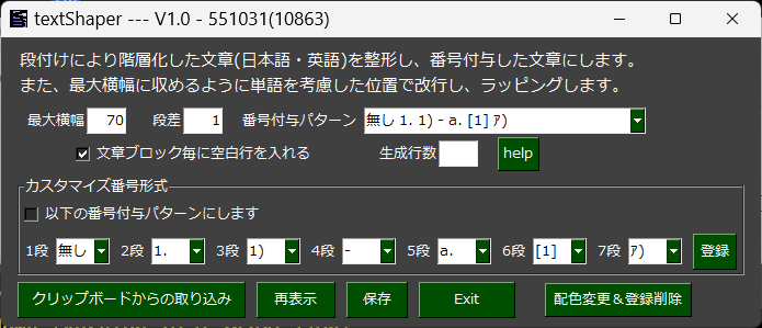 テキストに階層化した箇条書き番号を付加、かつ整形するソフト