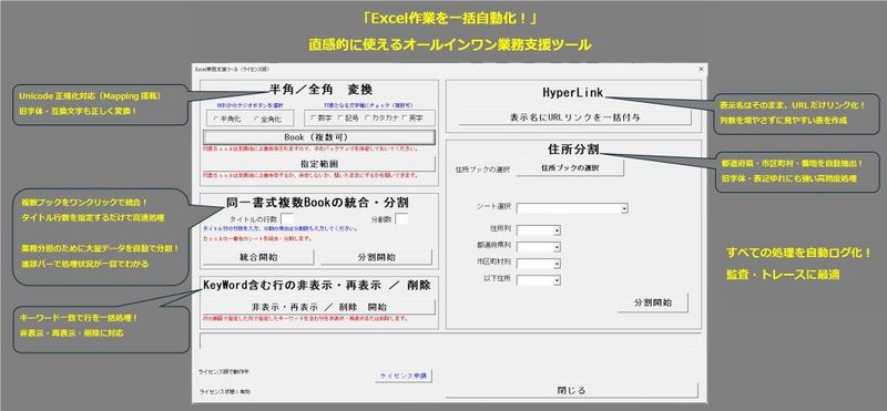 半角全角変換・ブック統合/分割・行非表示/削除・URL付与・住所分割