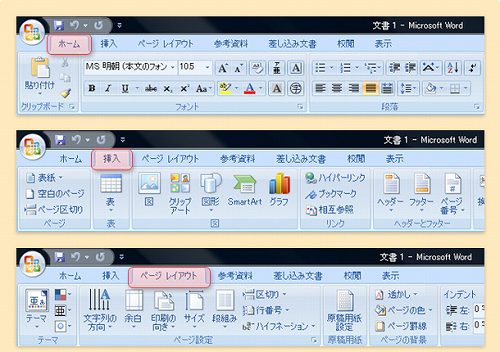 Word 2007 なら [ホーム] で書体や段落のスタイルを決めます。次に、[挿入] で図版を入れ、[ページレイアウト] で文書全体のデザインを決める。このように作業の流れ順に並んでいます。